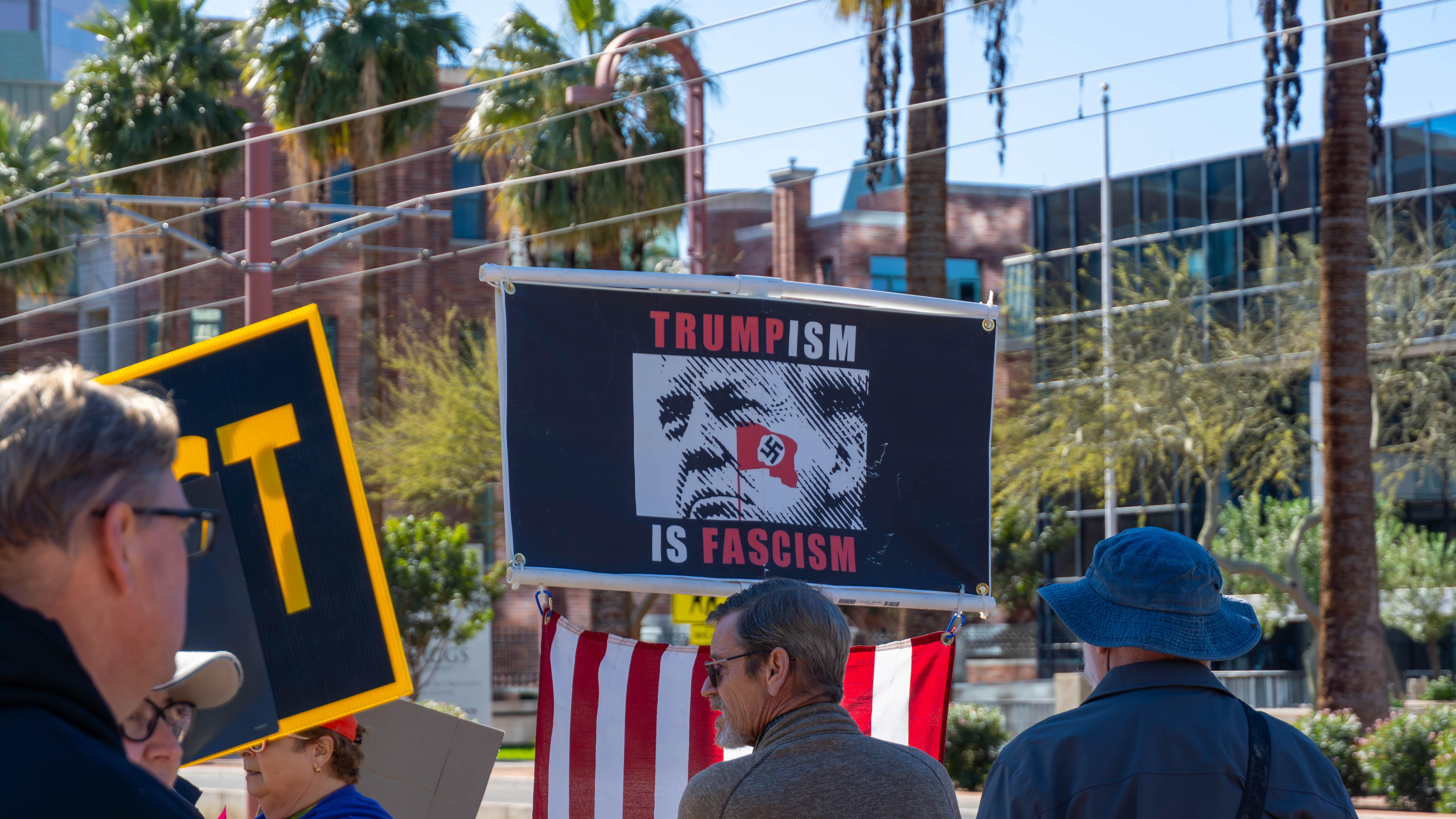 Protester holds up sign reading "Trumpism is Fascism" with image of Donald Trump and Nazi flag.